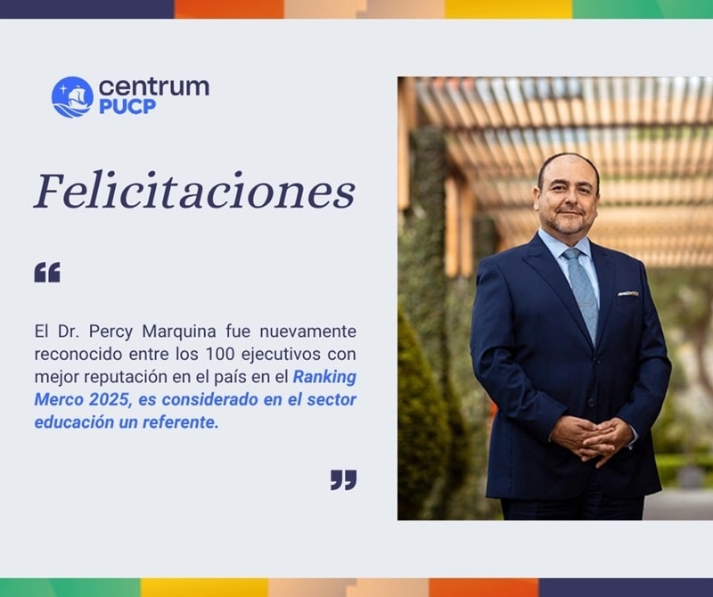 Centrum PUCP felicita a Percy Marquina, profesor principal del Departamento Académico de Postgrado en Negocios de la Pontificia Universidad Católica del Perú (PUCP), por estar presente en el Ranking Merco Líderes – Sector Educación 2025, consolidándose como líder educativo con reputación en el país.