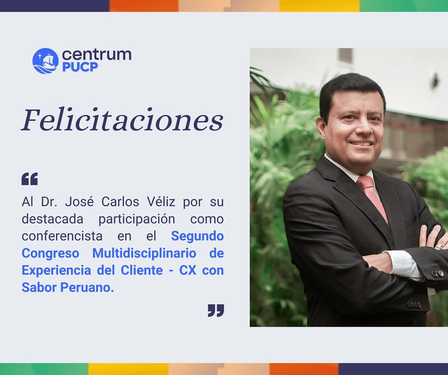 El compromiso de Centrum PUCP con la excelencia académica y la innovación educativa volvió a hacerse visible en un evento de alto impacto nacional. El profesor José Carlos Véliz, especialista en educación superior y experiencia del estudiante, participó como conferencista en el Segundo Congreso Multidisciplinario de Experiencia del Cliente – CX con Sabor Peruano, un espacio que congrega a profesionales, académicos y líderes de distintas industrias para analizar las nuevas tendencias de Customer Experience en el Perú.