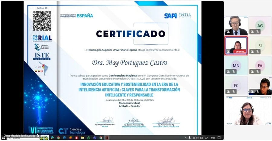 La profesora investigadora Dra. May Portuguez Castro, del Departamento Académico de Posgrado en Negocios de Centrum PUCP, continúa consolidando su presencia internacional a través de su participación en importantes eventos académicos realizados en Costa Rica, Ecuador y Perú, donde compartió experiencias, avances e investigaciones sobre innovación educativa, sostenibilidad y liderazgo en la era de la inteligencia artificial.