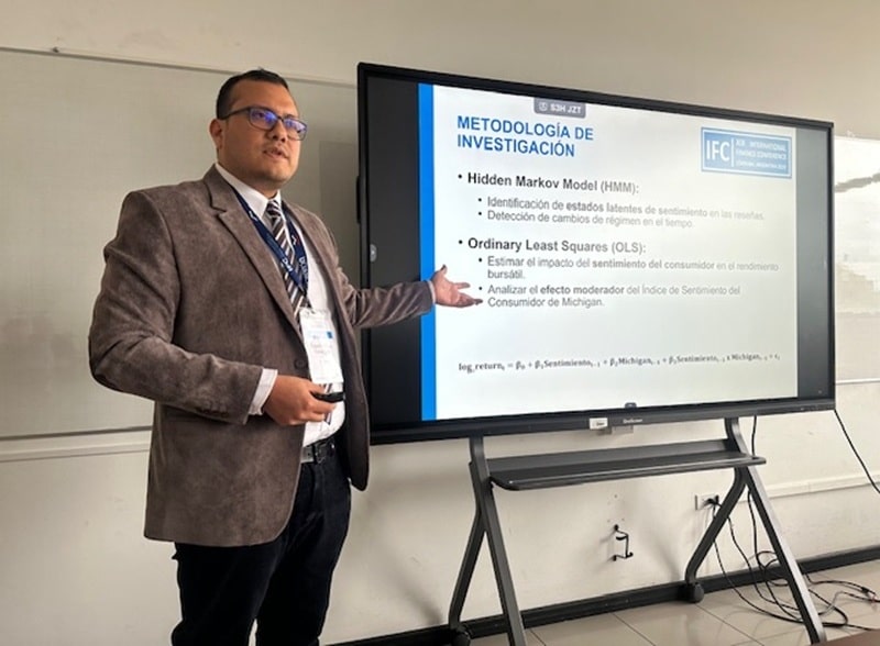 Promoviendo la internacionalización académica, el profesor Víctor Fajardo, docente investigador de CENTRUM PUCP, participó en la XXV edición de la International Finance Conference (IFC 2025), realizada en Cuenca, Ecuador, donde presentó su estudio “Sentimiento del consumidor y rendimiento bursátil: un análisis con modelo oculto de Markov”.
