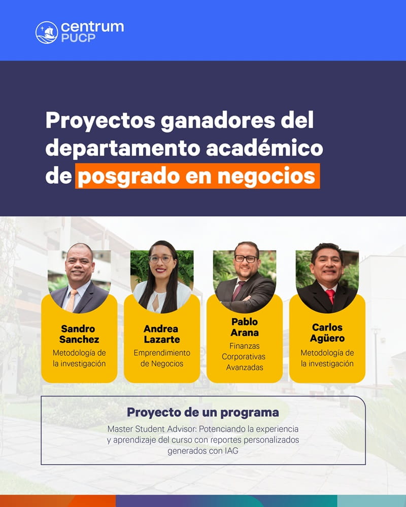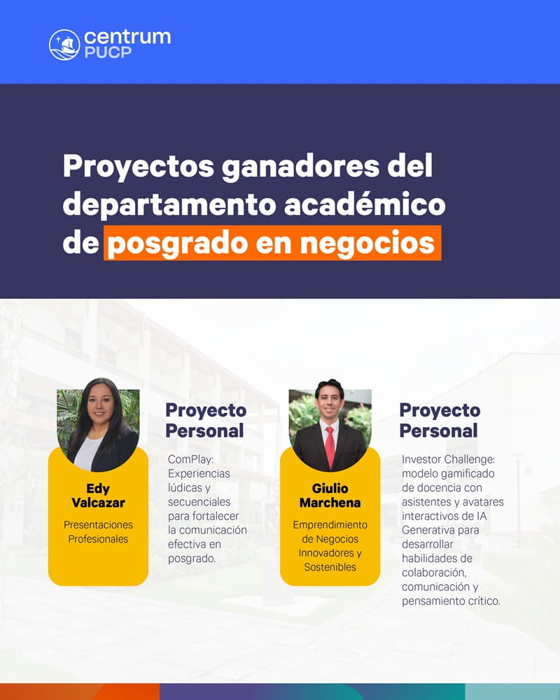 La participación de docentes de Centrum PUCP en esta convocatoria no solo evidencia creatividad académica, sino también coherencia con una visión institucional orientada a la excelencia, la innovación y el impacto sostenible.