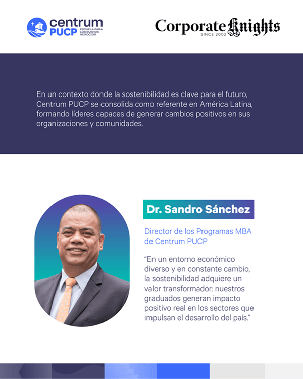 Según el Dr. Sandro Sánchez, Director de los Programas MBA de Centrum PUCP, “en un entorno económico diverso y en constante cambio, la sostenibilidad adquiere un valor transformador: nuestros graduados generan un impacto positivo real en los sectores que impulsan el desarrollo del país”.