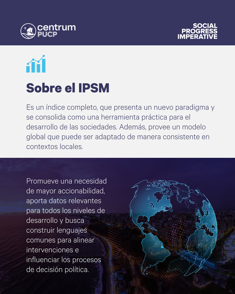El IPSM fue desarrollado por el Social Progress Imperative (SPI) en el año 2012, aunque comenzó haciendo cálculos retrospectivos a partir del año 2011. Es un modelo econométrico que facilita la comprensión de cómo viven las personas en todo el mundo, comparando quiénes están avanzando y quienes se están quedando rezagados. Mide el progreso social independientemente de los indicadores económicos como el PIB. Su idea central es simple pero contundente: Un país rico podría ofrecer una buena calidad de vida. Por lo tanto, en lugar de preguntar “¿Qué tan grande es la economía?”, el IPS pregunta: ¿Las personas gozan de buena salud? ¿Están seguras? ¿Tienen acceso a una excelente educación? ¿Tienen derechos, oportunidades y un medio ambiente limpio?