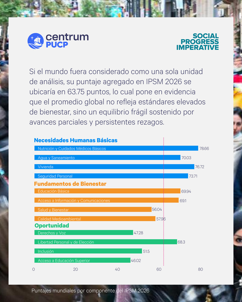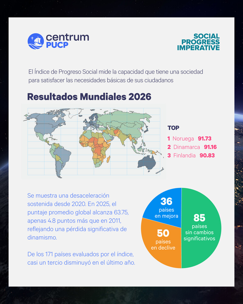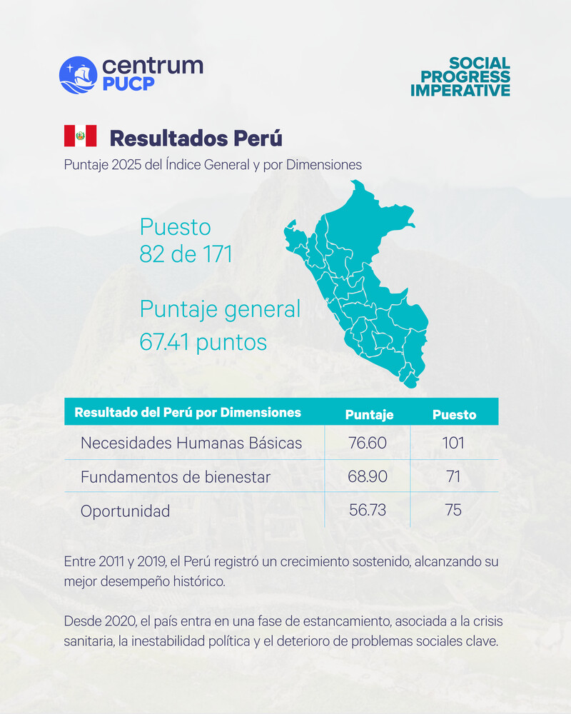 El Índice de Progreso Social Mundial (IPSM) 2025, publicado por el Social Progress Imperative en asociación con Centrum PUCP, escuela de negocios de la Pontificia Universidad Católica del Perú, evidencia que el Perú mantiene una trayectoria descendente en términos de progreso social, al ubicarse en el puesto 82 de 171 economías evaluadas, con una puntuación de 67.41 sobre 100. Este resultado confirma la pérdida de dinamismo y declive del progreso social del país desde el año 2018, cuando se ubicó en el puesto 66 a nivel mundial.