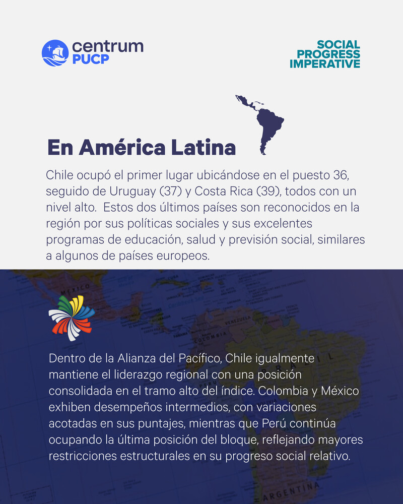 En América Latina, Chile ocupó el primer lugar ubicándose en el puesto 36, seguido de Uruguay (37) y Costa Rica (39), todos con un nivel alto. Estos dos últimos países son reconocidos en la región por sus políticas sociales y sus excelentes programas de educación, salud y previsión social, similares a algunos de países europeos. Perú se ubicó en el puesto 82, con un nivel Medio Alto, mostrando una leve mejoría en comparación con el año 2024 (dos puestos), pero manteniendo la tendencia hacia la baja desde el año 2018 en que ocupó el puesto 66 en este índice.
