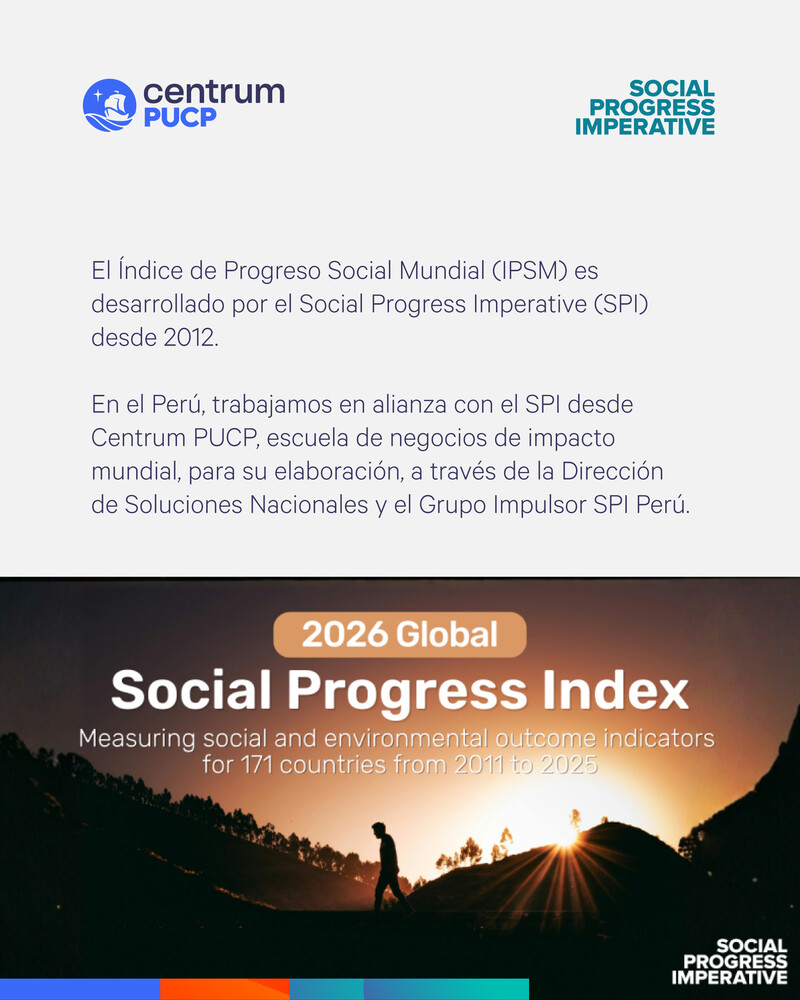 Para determinar el nivel del progreso social de Perú, la SPI trabaja en asociación con Centrum PUCP, específicamente con la Dirección de Soluciones Nacionales y el Grupo Impulsor SPI Perú. El índice se analiza a partir de tres dimensiones: (a) Necesidades Básicas Humanas, (b) Fundamentos del Bienestar y (c) Oportunidad.