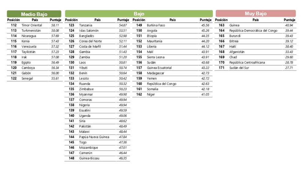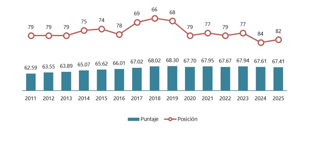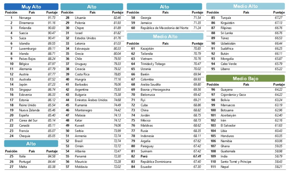 - Perú se ubica en el puesto 82 de 171 economías evaluadas, en el grupo de países con un índice Medio Alto. Chile (puesto 36) lidera en la región, seguido por Uruguay (37) y Costa Rica (39). En el otro extremo, Honduras (114) y Venezuela (116) ocupan los últimos lugares.