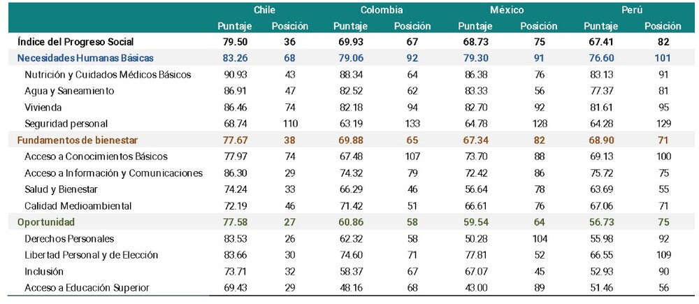 Finalmente, en la dimensión Oportunidades, Perú se ubica en el puesto 75, con brechas significativas en variables clave para el desarrollo inclusivo. Destacan los bajos resultados en libertad de elección (puesto 109), derechos y voz ciudadana (92) e inclusión (90), mientras que el acceso a educación superior de calidad muestra un desempeño relativamente mejor (puesto 56). Estos resultados confirman que sigue pendiente el fortalecimiento de la institucionalidad, la promoción de una sociedad más inclusiva y el desarrollo del talento humano alineado a las demandas del mercado, condiciones indispensables para sostener el progreso social en el largo plazo.