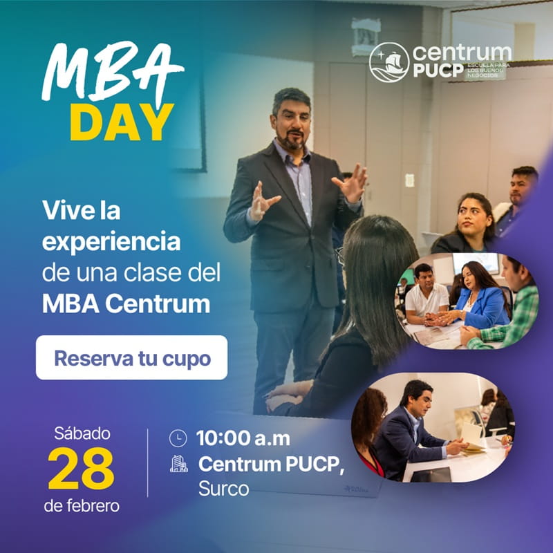 Elegir estudiar un MBA es una de las decisiones más importantes en la vida profesional. No se trata solo de adquirir nuevos conocimientos, sino de ampliar la visión, fortalecer el liderazgo y prepararse para los desafíos de un entorno empresarial cada vez más exigente. Con ese propósito, Centrum PUCP, escuela de negocios de la Pontificia Universidad Católica del Perú, presenta el MBA DAY, una experiencia presencial diseñada para que los profesionales conozcan de cerca lo que significa formar parte de uno de los programas de posgrado más reconocidos del país.