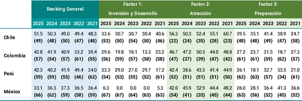 En el informe se señala que, el ranking evalúa a las economías en tres factores: (a) Inversión y Desarrollo, (b) Atracción y, (c) Preparación. Además, en cada factor se consideran un número determinado de indicadores, que en total suman 31.