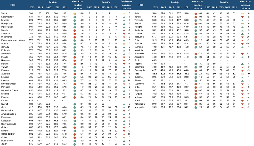 - A nivel global, el podio está encabezado por Suiza, Luxemburgo e Islandia. En contraste, Singapur, que en ediciones anteriores ocupaba el Top 3, desciende al séptimo lugar. En el plano regional, Chile (49°) se consolida como el país mejor posicionado, mientras que Brasil (67°) y Venezuela (68°) se mantienen en los últimos lugares del ranking.